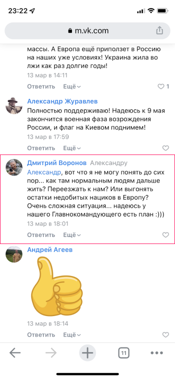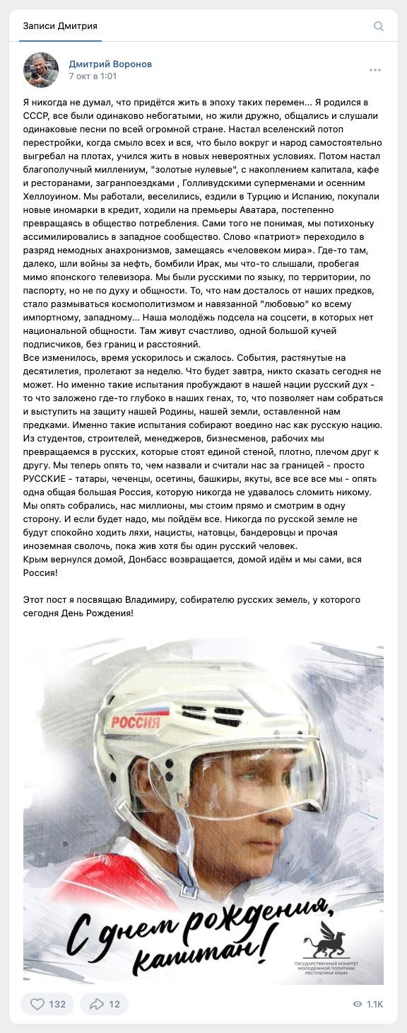 In 2018, Dmitry Sedov moved to Crimea, which was annexed by Russia in 2014. And after February 24, 2022, when Russia invaded Ukraine, Dmitry Sedov (Дмитрий Воронов) became very active on the Russian social network VK (below are the screenshots: original in Russian and English translation):