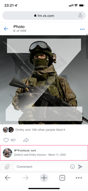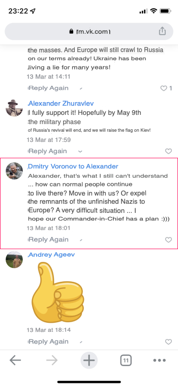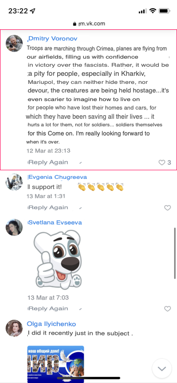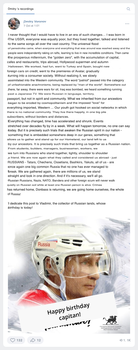 In 2018, Dmitry Sedov moved to Crimea, which was annexed by Russia in 2014. And after February 24, 2022, when Russia invaded Ukraine, Dmitry Sedov (Дмитрий Воронов) became very active on the Russian social network VK (below are the screenshots: original in Russian and English translation):